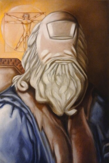 - L'UNIONE DEGLI OPPOSTI: CIOTOLA CUSTODISCE L'ICONOGRAFIA CLASSICA LA BARBA SENILE, LA GIACCA AZZURRA, L'UOMO VITRUVIANO SULLO SFONDO MA SOSTITUISCE IL VOLTO CON IL CILINDRO BIANCO DEL DITO. QUESTO GESTO TRASFORMA IL SAPERE SCIENTIFICO DI LEONARDO NELLA VERITÀ ONTOLOGICA DI CIOTOLA.