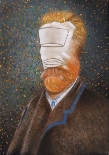 - LA CATTURA DELL'ENERGIA: CIOTOLA MANTIENE IL DINAMISMO CROMATICO E IL CAPPOTTO ICONICO DI VAN GOGH, MA NE "AZZERA" IL VOLTO CON IL SIGILLO DELLA FINGER ART. QUESTO ATTO TRASFORMA L'ENERGIA PSICOLOGICA DI VINCENT NELL'ENERGIA BIOLOGICA DI CIOTOLA.